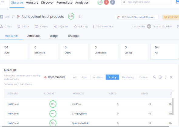 The Observe menu opens and displays the Measures section, which provides the Data Quality (DQ) score along with detailed information about the dataset.