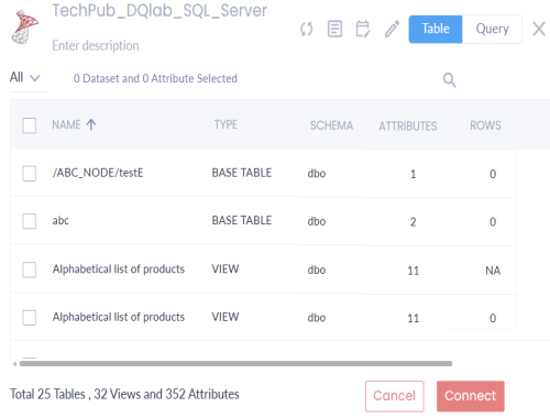 This topic walks you through adding datasets and views, and running data profiling on the catalog for Sql Server database as an example. Similarly, you can run data profiling for other databases.