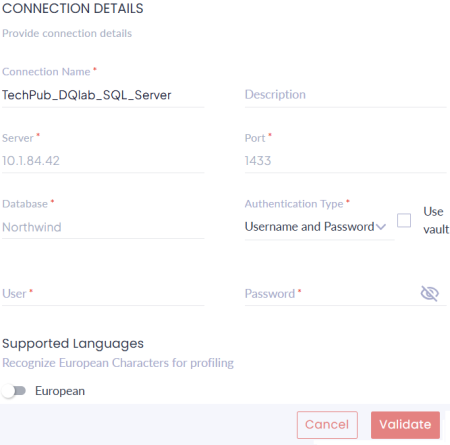 Specifies whether European characters are recognized during data profiling. Switch the European option on to include European characters. |