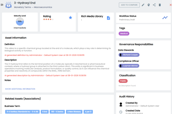 For example, the following image displays, details of the 3 - Hydroxyl End business term. This displays the asset's details, rating, data value score, maturity level, sensitive classification, tags, associations, additional properties, governance responsibilities, audit history, and more. Now, each associated asset is clickable. Clicking on any of these assets takes you to the specific asset's page.