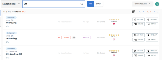 On each environment tile, you can view information, such as business purpose, classification, tags, status, rating, and favorites. Apart from this, you can add corresponding tasks, and view mind maps, lineage, and impact.