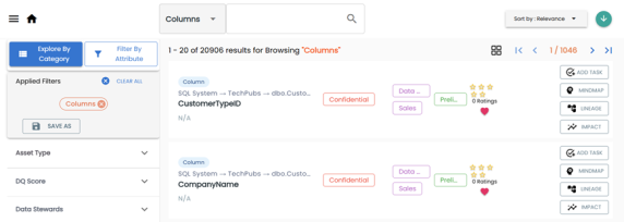 For example, in the following image, a list of 20906 columns appears when you click the Columns card and then click Browse Columns on the Discover Assets dashboard.