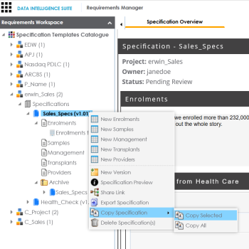 - Copy Selected: To copy specifications, select the specification, right-click the specification and click Copy Selected.
