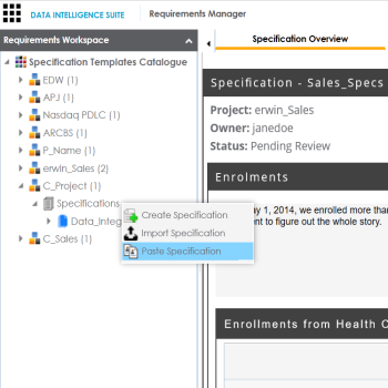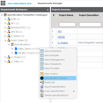 - Right-click a specification to view specification management options.