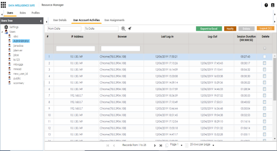 - To save the selected user's account activities in .xls format, click Export to Excel.