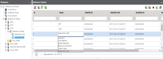 The corresponding column in the reference table is now configured as a drop-down and populated with values from the selected codeset.