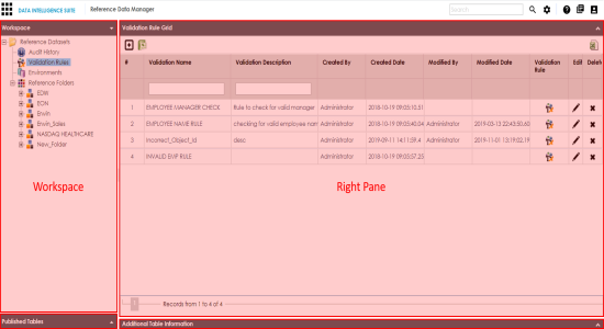 Use this pane to browse and work on validation rules, environments, reference folders, and reference tables. |