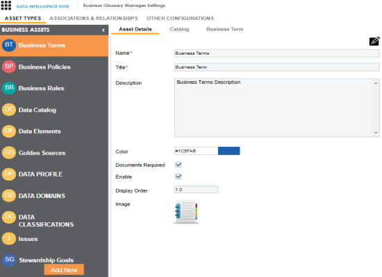 Asset types are the glossary objects (business terms, business rules, business policy, and so on) that you work on in the Business Glossary Manager. For each of the asset types, you can configure several settings, such as their availability, properties, and so on.
