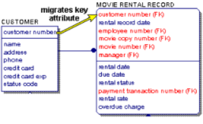 When you create a relationship between entities, the primary key attributes of the parent entity are automatically migrated to the child entity. The designator (FK) indicates the name of the migrated key attribute, also known as a foreign key. This migration occurs automatically in the physical model.
