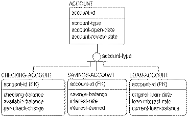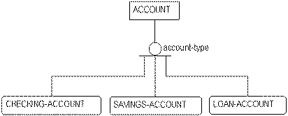 In this figure, an ACCOUNT is either a CHECKING-ACCOUNT, a SAVINGS-ACCOUNT, or a LOAN-ACCOUNT. Each subtype entity is an ACCOUNT and inherits the properties of ACCOUNT. The three different subtype entities of ACCOUNT are mutually exclusive.