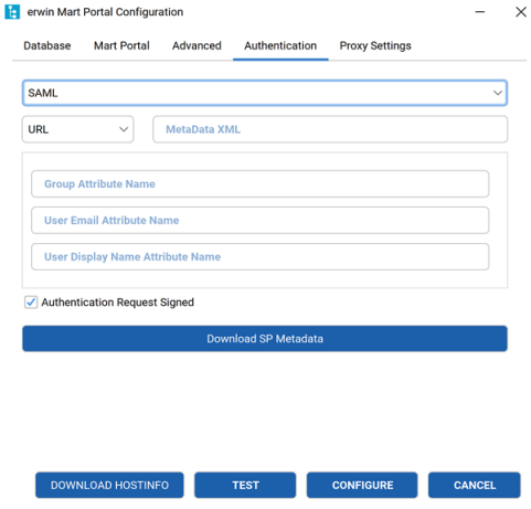 Click Upload metadata file and select the file that you downloaded (erwin Mart Portal Configuration > Authentication tab > Download SP Metadata) during erwin Mart Portal configuration.
