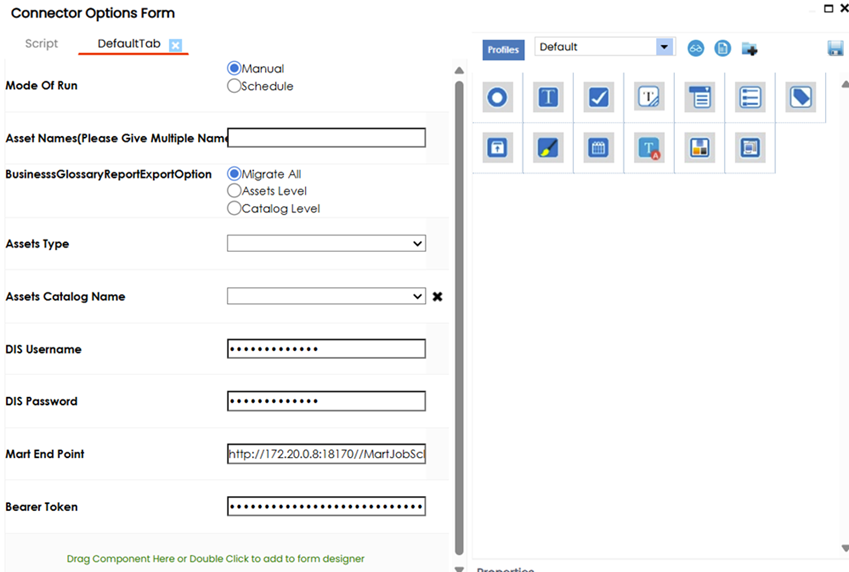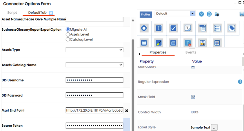 - In the Connector Options Form, select the Bearer Token option under DefaultTab.