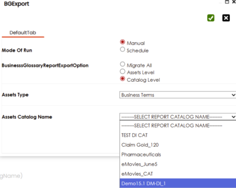 - Select Asset type and Asset Catalog Name based on your requirements. For example, in this case, we selected Asset Type as Business Terms and Asset Catalog Name as Demo15.1 DM-DI_1.