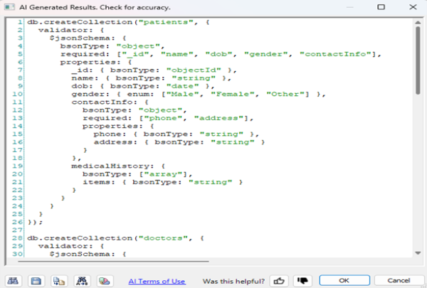 Enter your model description in the AI prompt box. For example, Create a MongoDB schema for a hospital system with patients, doctors, appointments, and prescriptions.