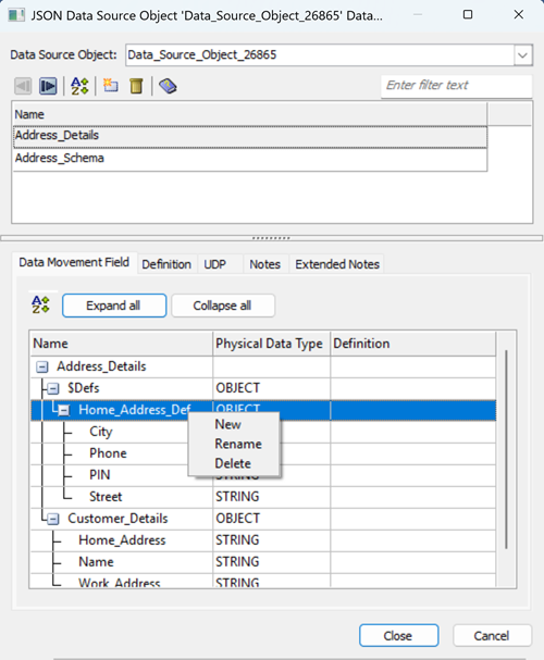 The Data Movement Field UI has been updated to include the following options when NoSQL databases are used in the base model, target data source, or both.