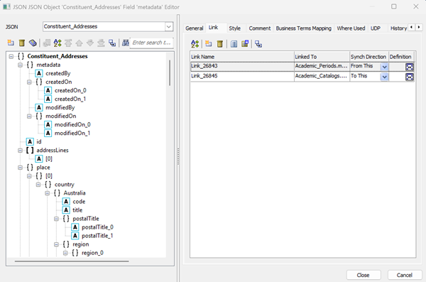 The Link tab is available in the Attribute Editor and the Column Editor for all NoSQL databases. You can use it to access the Link Wizard. For more information, refer to the Link Wizard section. |