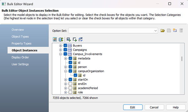 Tree view in the Object Instance tab of the Bulk Editor Wizard: You can now expand or collapse the tree to review and select objects for editing.