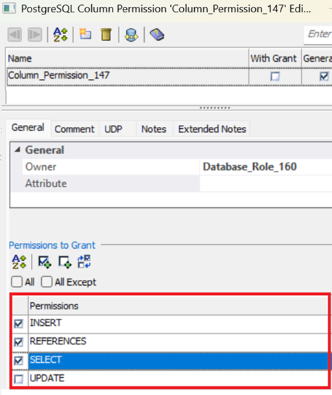 You can now assign multiple permissions to PostgreSQL objects using new checkboxes. For example, in the PostgreSQL Column Permission Editor, under the Permissions section, select the required permission checkboxes. You can also select either the All or All Except checkbox to grant all permissions or all except the ones you choose to exclude.