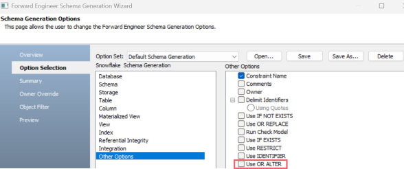 The Forward Engineer Schema Generation Wizard now includes a "Use OR ALTER" checkbox for Snowflake.