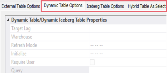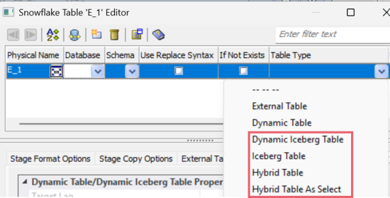 Additionally, the Snowflake Table Editor displays property tabs for each table type. You can configure and manage attributes specific to each table type directly within the editor. These properties appear only when you select a corresponding table type. The screenshot below displays the property tabs for the newly added table types.
