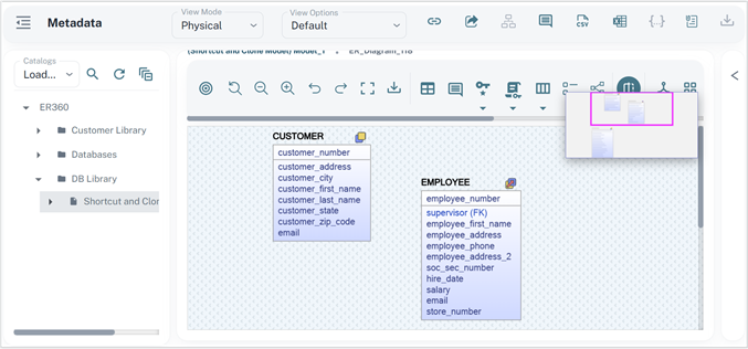 When a model containing shortcut and clone entities is harvested to erwin ER360, these entities are indicated by shortcut and clone icons in the ER diagram.
