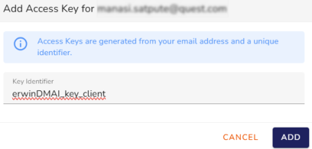 Enter a key identifier in the corresponding field, and then click Add. For example, erwinDMAI_key_client. Access key is generated from your email address and this unique identifier.