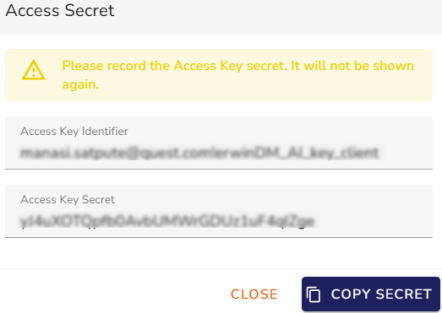 Click Copy Secret to copy. Save the Access Key Secret. It will not be displayed again.