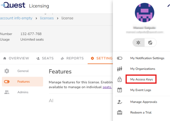 On the Profile menu, select My Access Keys or go to https://licensing.ism.quest.com/user/access-keys.