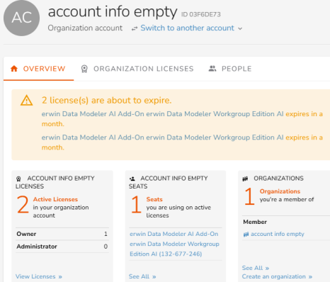 The account info empty page appears. By default, the Overview tab opens and displays the activate licenses.