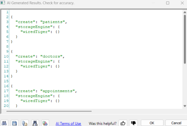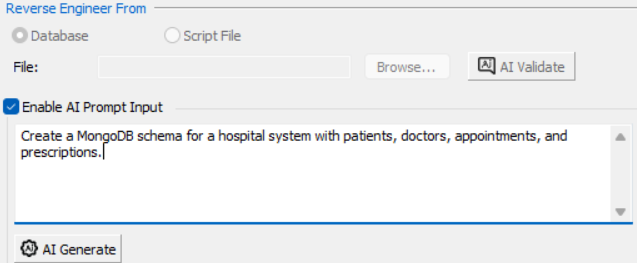 Enter you model description in the AI prompt box. For example, Create a MongoDB schema for a hospital system with patients, doctors, appointments, and prescriptions.