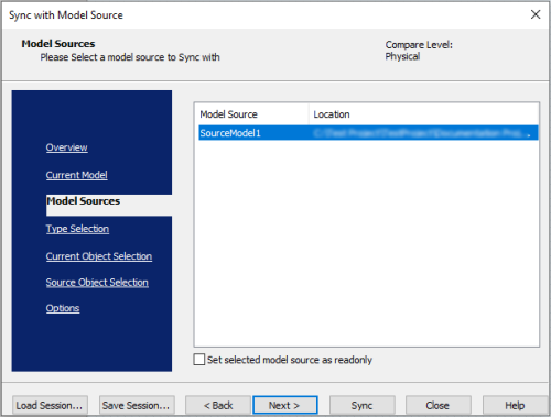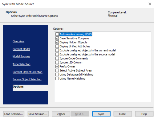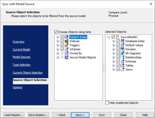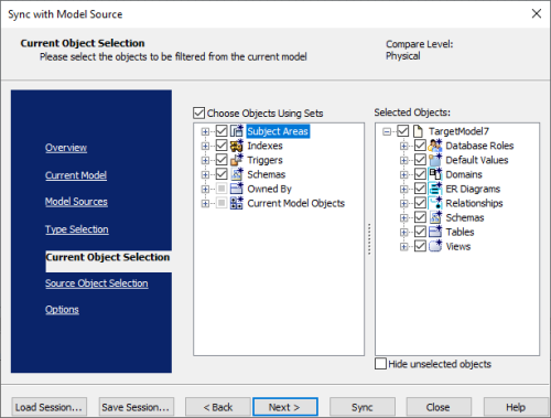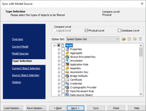 Logical Level: Indicates that all objects that are contained on the logical level of a model are compared Physical Level: Indicates that all objects that are contained on the physical level of a model are compared Database Level: Indicates that all objects that are contained on the database level of a model are synced |