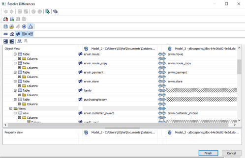- On the Object View section, move all applicable changes from the source model to the target model using the