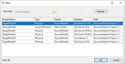 The Mart window appears. It displays details such as the project path in mart, model names, model type, parent models, databases, and path.