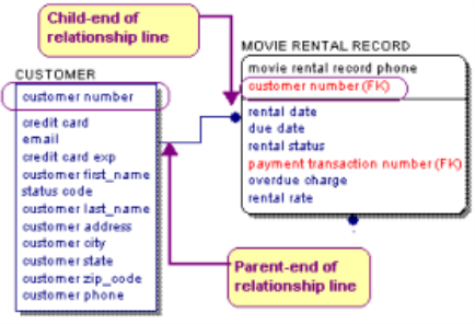 An important object in a data model is the relationship, which is represented by the solid or dashed line that connects two entities or two tables. A relationship line connects a parent and a child entity or table. Usually, a symbol appears at the child-end of the relationship line. The symbol changes based on the diagram notation that you select.