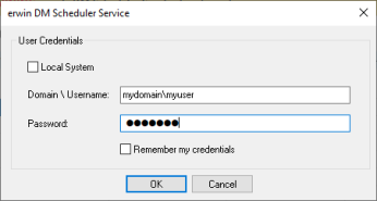 Note: To be able to use Windows Authentication, instead of Local System, use Domain\Username to start the erwin DM Scheduler Service.