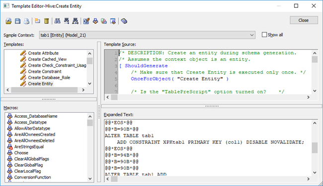 Shows all templates found in the template file. They are categorized based on their names as follows: Create, Alter, Drop, and Insert templates; Clause templates (reusable fragments employed by other templates); and Miscellaneous templates. Double-click a template to edit it. By default, when the Template Editor is invoked, it attempts to select the Create Entity template.